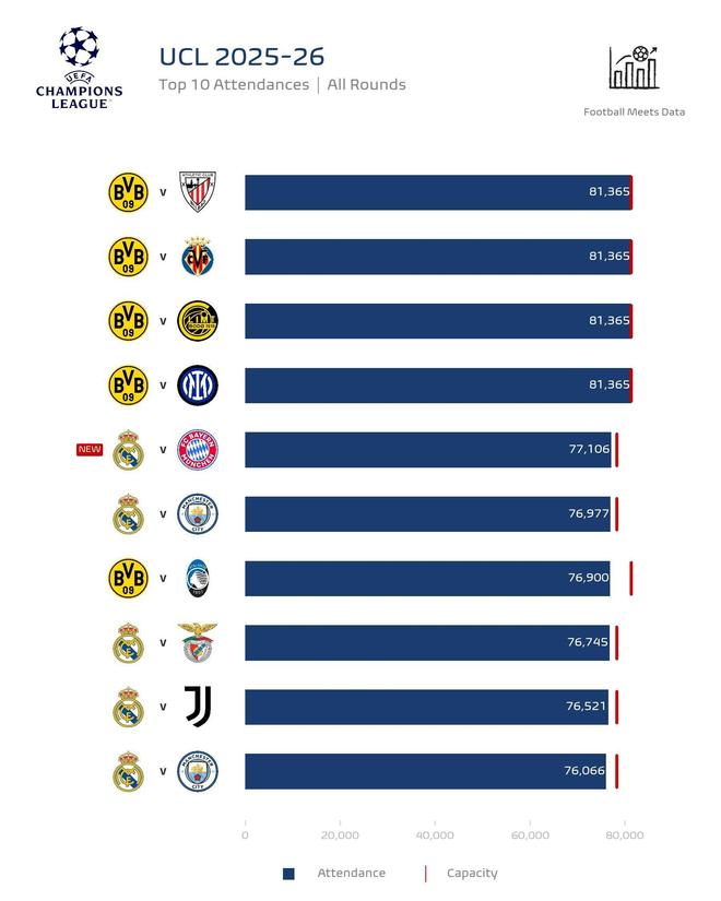 本赛季欧冠上座人数榜前十:多特包揽前四,皇马vs拜仁第五
